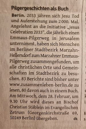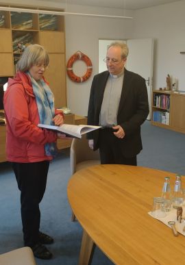 Übergabe der Dokumentation mit den ersten 80 Berichten über unseren Emmaus-Pilgerweg im Stadtbezirk-Marzahn-Hellersdorf an den Bischof der EKBO Dr. Christian Stäblein