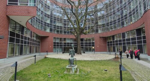 Das Bischofsbüro liegt in der 4. Etage des hinteren, um die Jahrtausendwende neu errichteten Gebäudes, das diesen stattlichen Baum zu umarmen scheint und vor dem eine Skulptur an den so gern musizierenden König David erinnert.