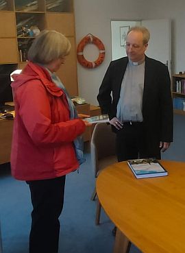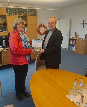 Bischof Stäblein empfing uns in seinem Büro, um dessen ovalen Tisch wir acht von der Pilgergruppe gut Platz hatten. Zuerst erfolgte die Übergabe unseres Berichtbandes und der Hinweis auf die einleitenden Seiten zur besseren Orientierung. Denn bei 80 Stationen fiel es uns selber schwer, noch zu wissen, wann wir wo gewesen waren. So sind die Stationen nun zusammengefasst nach der Art, in der sie Jesu Anliegen und Geist weitergeben, dann nach Postleitzahlen und schließlich alphabetisch sortiert.