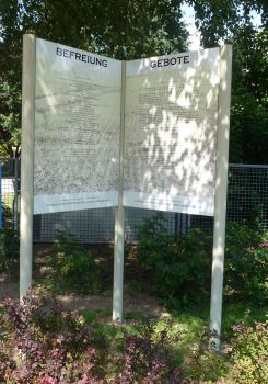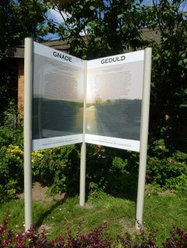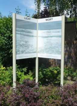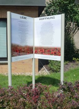 Hier sind die Schautafeln zu sehen, die seit dem Sommer 2017 an der linken Seite des Gemeindezentrums (von der Straßenbahn aus gesehen)
