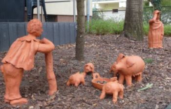 Die Kinder begannen mit den Schweinen, die der "verlorene" Sohn zu hüten hatte. Sie sollten auf der anderen Seite des Hauseingangs ihren Platz finden.