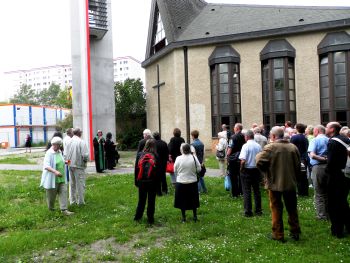 Manfred Stolpe wählte unser Gemeindezentrum aus. Er hat damals für unsere Landeskirche die Verhandlungen gegen „härtesten Widerstand“ – wie er schreibt – mit den staatlichen Stellen geführt. „Die Errichtung eines Kirchturms und die Anschaffung von Glocken unterbanden die staatlichen Behörden damals. Doch die Gemeinde gab nicht auf und im Herbst 2012 kann sie endlich einen Turm mit Glocken einweihen.“