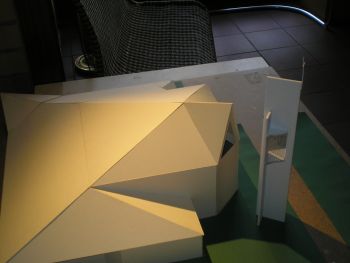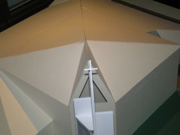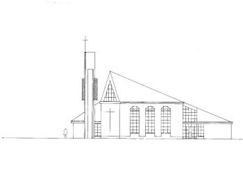 Es lagen uns zwei Entwürfe für einen Glockenturm vor. Sie sind als optische Verlängerung des Daches gedacht, das in seiner Form an einen Vogel erinnert. So würde der Turm wie der noch fehlende Kopf des Vogels wirken.