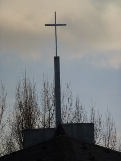 So ist das Kreuz von der Hofseite her über dem Gemeindezentrum zu sehen.
