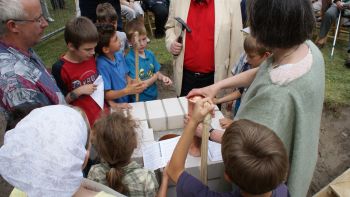 KInder schrieben ihre Namen auf Legosteine, die dann in die Schatulle gelegt wurden.