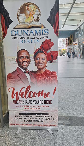 Wer sonntags vormittags durch die Passage geht, wird diesen Aufsteller sehen: "DUNAMIS International Gospel Center Berlin." Die Besucher werden auf englisch willkommen geheißen: "Wir sind glücklich, dass ihr hier seid" und zwar von den Pastoren Dr. Paul und seiner Frau Dr. Becky Paul-Enenche, den Gründern dieser jungen und doch schon weltweiten Kirche aus Nigeria. Unter der hiesigen Adresse ganz unten steht: "Erfahren sie die Herrlichkeit Gottes wie nie zuvor."
