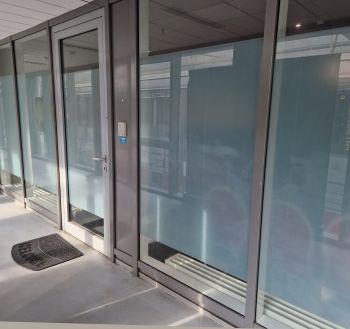 Wo sonntags der Aufsteller steht, der zum Gottesdienst um 10 Uhr einlädt, geht es zum Fahrstuhl, der in die 1. Etage führt.