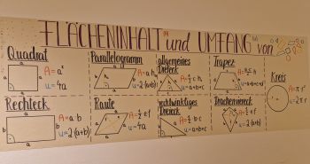 Gegenüber an der Wand, wird die Berechnung von Flächeninhalten und Umfang dargestellt - eine Erinnerung daran, dass sich hier die Werkstätten der Manege-Schule befanden, die zu eng wurden und sich nun im Gebäude gegenüber, in der ehemaligen Schule der BVG befinden.