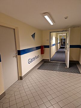 Auf dem Flur wird mit großer Schrift darauf hingewiesen, was es hier im Hause alles gibt.