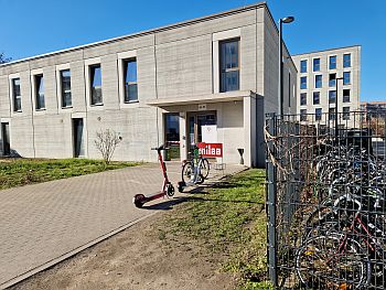 "milaa" liest man auf rotem Untergrund am Eingang zur Gemeinschaftsunterkunft - ein Name, der uns erst einmal nichts sagt. Ein Blick auf die Internetseite der gemeinnützigen GmbH erklärt den Namen: "miteinander leben, aber anders". Im Juni 2015 wurde sie vom Evangelischen Diakonieverein Berlin-Zehlendorf e.V. gegründet und hat heute ca. 170 Mitarbeiter*innen an 18 Standorten und in der Verwaltung. Der Diakonieverein Berlin-Zehlendorf wiederum hat eine viel längere Geschichte: 1894 gegründet ist er heute Träger von rund 50 Kliniken, Alten- und Pflegeeinrichtungen und ist nun durch seine Tochter milaa auch in der Migrationsarbeit an zurzeit fünf Standorten tätig.