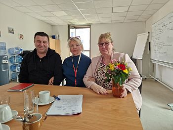 Wir wurden von der Leiterin der Einrichtung Frau Tenge, dem Sozialarbeiter Musab Al Drawsha und der Koordinatorin für Ehrenamtsarbeit Elena Romaschew zum Gespräch empfangen. Seit 2017, also seit Fertigstellung des Baus ist die milaa gGmbH Betreiberin dieser Wohnunterkunft für ca. 450 Bewohner.