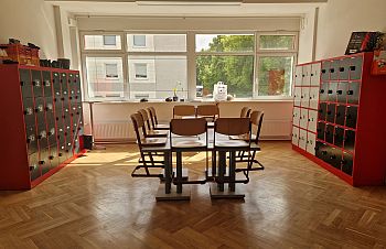 Hier im Eingangsbereich hat jeder Jugendliche ein Schließfach und kann man sich in den Pausen aufhalten.