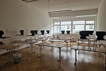 Jetzt um 15:15 Uhr sind alle Stühle hochgestellt, weil jeden Tag hier der Fußboden gereinigt wird. Die jungen Menschen sollen spüren, dass sie willkommen sind und wertgeschätzt werden.