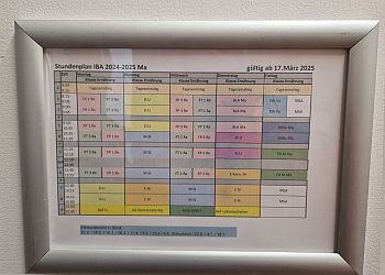 Neben der Tür zu den Klassenräumen hängt der Stundenplan. Er ist sehr vollgepackt. zweimal vier Wochen Praktikum wie auch jede Woche Theorie- und Praxisstunden in einem der beiden Bereiche Küche/ Ernährung bzw. Malern/Raumgestaltung gehören dazu .