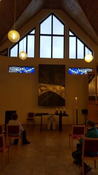 Im Kirchraum fällt das Altarbild, gestaltet von Rüdiger Roehl, ins Auge, ein liegender gekreuzigter Christus, der wie eine Brücke Menschen verbindet. Ein Band bunter Glasfenster ringsrum schmückt den Raum.