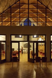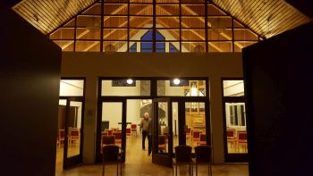 Besonders einladend wirkt der Raum, als wir beim Gehen sind, es inzwischen dunkel geworden ist und der Raum für den nach uns kommenden Chor vorbereitet wird und zum Lüften die Türen nach draußen auf das Gartengelände weit geöffnet wurden: