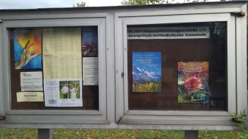Schon der Blick in den „Doppelschaukasten“ zeigt, dass hier zwei Gemeinden zu Hause sind und zwar seit Einweihung des Hauses 1986: die ursprünglich noch nicht mit den Biesdorfern fusionierte Versöhnungskirchengemeinde und die Evangelisch-methodistische Gemeinde in Marzahn, um deren Vorstellung es heute gehen soll.