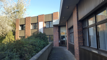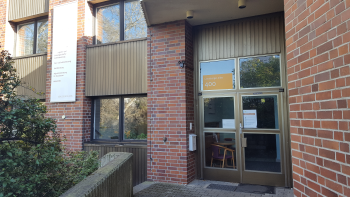 Der gepflasterte Weg führt links am Eingang zur Kirche vorbei in den hinteren Teil des Gemeindehauses, wo wieder ein gelbes Schild über der Tür und ein Banner an der Wand zeigen, dass man richtig ist: Hier ist die Landsberger Allee 400 mit der Beratungsstelle.