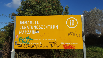 Beim Näherkommen kann man lesen: „Immanuel Beratungszentrum Marzahn“1, die Telefon-Nr: (030) 9352063, die Adresse der Webseite: www.immanuel.de 2und „DEM LEBEN ZU LIEBE“.