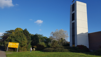 Auf der rechten Seite der Landsberger Alle stadtauswärts fällt dem Vorbeifahrenden ein großes gelbes Schild am Wegrand auf und dahinter in einigem Abstand der Turm der katholischen Kirche „Von der Verklärung des Herrn“.