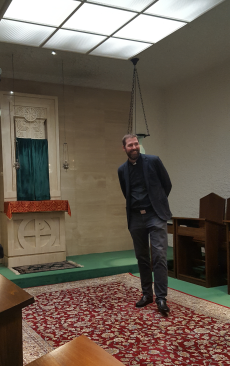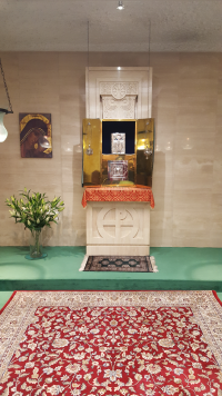 Am besten ist dies zu erleben durch den Besuch des Allerheiligsten des Hauses, dem Raum des Gebets und der täglichen Andacht, eingerichtet wie ein jüdisches Lehrhaus durch die Art des Gestühls. Der grüne Fußbodenbelag und der rote Teppich sollen ans Paradies erinnern. Auf sie fällt das Licht, nicht nur wie jetzt von oben, sondern bei Sonne auch durch die bunten Scheiben auf der linken Seite. Hier ist das Heiligste noch verdeckt durch den Vorhang.