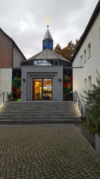 Man sieht es hier auf dem Foto nicht, der Fußbodenbelag ist blau wie das Wasser. Erinnert wird an Petrus, der auf dem Wasser Jesus entgegenlief und als er zweifelte, begann zu sinken, doch von Jesus gerettet wurde. Das Wasser – hier ein Symbol für das, was unser Leben und unseren Glauben bedroht, aber doch uns nichts anhaben kann, wenn wir uns zu Jesus halten.