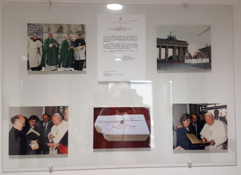 Im Eingang zur Kapelle in der Wand ist der Grundstein zu sehen, den Papst Johannes Paul II. bei seinem Besuch in Berlin 1996 aus dem Petrusgrab in Rom mitbrachte, dokumentiert mit Fotos .
