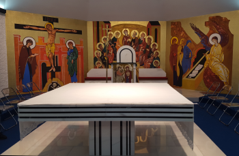 In der Mitte des Raumes - ein großer weißer Marmortisch. Er lädt ein zur Eucharistie, zum gemeinsamen Mahl und Gebet, zur Gemeinschaft untereinander und mit Christus.