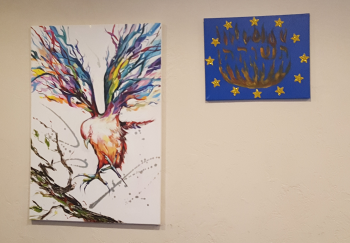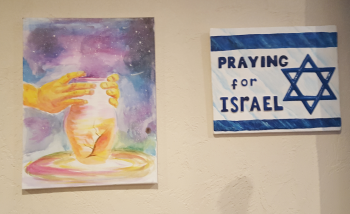 Das linke Bild wurde der Gemeinde von einer israelischen Gemeinde geschenkt. Es erinnert an den Vergleich Gottes mit einem Töpfer bei Jeremia 18, 4-6, wo es heißt „Siehe, wie der Ton in des Töpfers Hand, so seid auch ihr in meiner Hand, Haus Israel.“