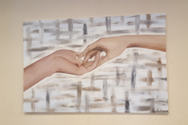 An der Wand gegenüber fällt dieses schöne selbstgemalte Bild auf, das an die berühmten Hände von Michelangelo in der Sixtinischen Kapelle erinnert, gemalt von einem Mädchen aus der Gemeinde.