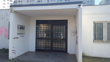 Der Fußweg davor führt hinter den Hochhäusern entlang, an Sportplätzen vorbei zu einem weißen Flachbau mit der Hausnummer drei oben rechts und links am Vordach, leicht zu übersehen, ebenso wie die Klingel an der Tür.