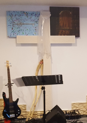 Uns fallen die schönen Gemälde im Raum auf. Über dem Kreuz rechts eine Tür – verschlossen, links daneben das fröhliche hellblaue mit zwei Schlüsseln, einem großen und einem kleinen. Das gibt Anlass zu fragen und zum Gespräch: Was bedeutet das? Der /die Schlüssel zum Himmelreich?