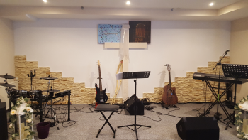 Wir werden in den Kirchraum geführt, wo sich sonntags um 12 Uhr die Gemeinde zu einem ca. zweistündigen Gottesdienst mit viel Lobpreis und Anbetung trifft. Wenn jemand kommt, der kein Russisch versteht, wird für ihn übersetzt.