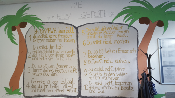 Beim Eintreten in den Raum fiel uns gleich das große schöne Wandbild mit den 10 Geboten auf.