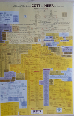 An der Wand ein Plakat mit dem Stammbaum von Adam und Eva bis zu Jesus.