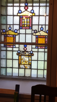 Im Krieg wurden mehrere der schönen Glasfenter der Kirche zerstört. Aus den erhaltenen Resten wurde für die Kinder dieses kleine Fenster gestaltet, das den kleinen Raum nun in freunliches Licht taucht.