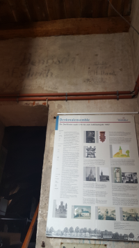 Zuerst kommen wir in eine Kammer, von der aus früher die Glocken geläutet wurden. Oft war das eine Aufgabe der Konfirmanden, die sich die Zeit zwischen Beginn des Gottesdienstes und dem Vaterunser damit vertrieben, an den Wänden ihre Namen zu verewigen, sogar ganz oben, wohin man nur mit einer Leiter kommt. Als Teil der Dorfgeschichte wurde dies bei der Renovierung so gelassen.