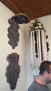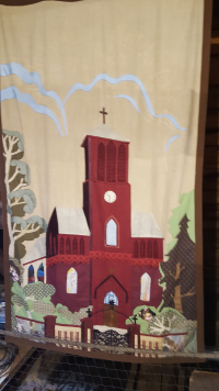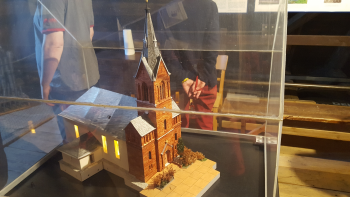 Hier zeugen ein Vorhang mit dem Bild und das Modell der Kirche, wie Gemeindegliedern ihre Kirche am Herzen liegt.