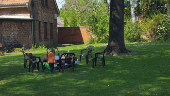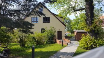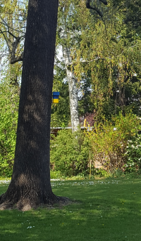 An dem Baum daneben fällt jemandem aus unserer Gruppe das Vogelhäuschen in den Farben der Ukraine auf. Ein Zufall? Der Webseite und der Gemeindezeitung der Kirchengemeinde Kaulsdort jedenfalls ist zu entnehmen, dass hier viel zur Unterstützung der Flüchtlinge und der Ukraine geschieht.