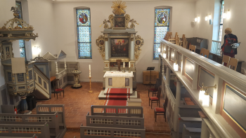 Von oben, von der breiten Empore aus wirkt der Kirchraum viel größer. Nach der vor kurzem erfolgten Renovierung erstrahlt er hell und freundlich und die bunten Glasfenster kommen voll zur Geltung.
