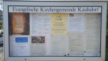 Hier noch ein Blick auf den Schaukasten der Gemeinde. Viel für alle Altersgruppen ist hier an Treffen und Aktivitäten zu finden. Ein Blick auf die Webseite lohnt sich und erst recht ein Besuch hier.