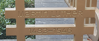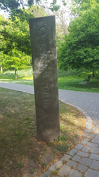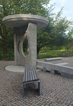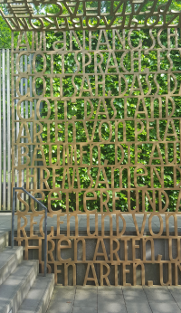 om Chinesischen Garten aus kommend sahen wir zuerst diese Stele mit griechischen Buchstaben und auf der Rückseite den Hinweis auf den Förderer: die Allianz-Umweltstiftung, die sowohl den Orientalischen wie auch nun den Jüdischen Garten mitfinanzierte.