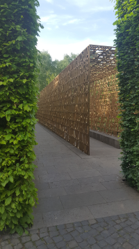 Er liegt nicht weit entfernt und wiederholt nicht, was wir im Christlichen Garten schon lasen, sondern ist so ganz anders. Auch er ist das Ergebnis eines Wettbewerbs, den Manfred Pernice und Wilfried Kuehn vom Landschaftsarchitekturbüro „atelier le balto“ gewannen, sowie der Beratung von jüdischen Fachleuten und von zweijähriger Bauzeit.
