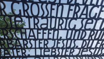 Schwieriger zu lesen sind die Texte im Dach des Kreuzwegs. Dafür entsteht ein eigener Reiz durch den Blick zum Himmel.