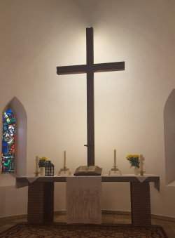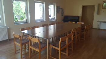 Ein großer Saal, durch eine Holzwand zu verkleinern in zwei, ermöglicht im Winter hier Gottesdienste zu feiern und ist Übungsraum für den Chor und die Posaunen.