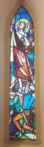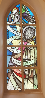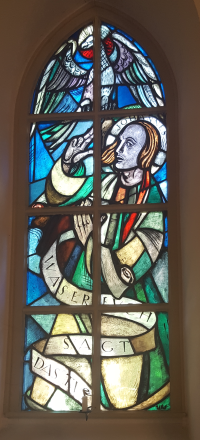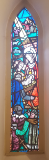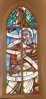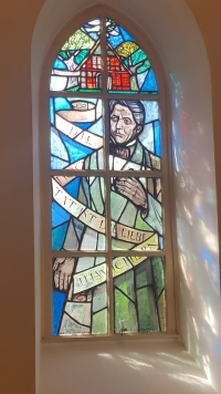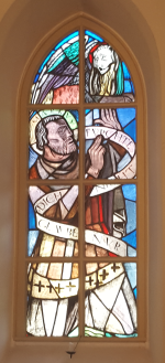 Auf der linken Seite weisen die Fenster auf Paul Gerhardt, Wichern und Luther hin und damit auf das, was der Gemeinde wichtig ist: das Lob Gottes durch Gesang und Musik, die tätige Nächsten liebe und Sorge für die Benachteiligten und das vierfache Solus Luthers: „sola scriptura "- allein die Schrift, „sola fide“ allein durch den Glauben. „sola gratia"- allein durch Gnade, „solus Christus“ - allein Christus.