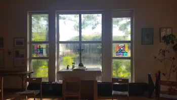 Rechts im Eingang erklären bunte Fenster symbolisch christliche Feste. Auf dem Ständer sind Kinder der Gemeinde auf fröhlichen Fotos zu sehen.