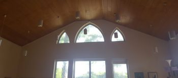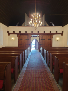 Der Blick zum Eingang zeigt, wie Holz die Gestaltung des Raums bestimmt und zeigt oben die Schuke-Orgel, die sich für hervorragende Kirchenmusik eignet.