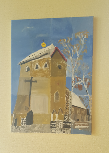 Dieses schöne Bild von der Kreuzkirche wurde in Gemeinschaftsarbeit erstellt. Jede Gruppe bekam einen Ausschnitt der Kirche zur Gestaltung und anschließend wurde sie zusammengesetzt und ergab nun dieses moderne Kunstwerk.