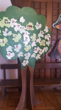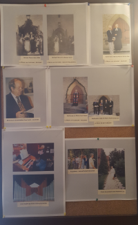 Auf der linken Seite werden die bisherigen Pfarrer der Gemeinde gezeigt. Den Fotos gegenüber steht ein Baum mit Bildern von in der Gemeinde Getauften.